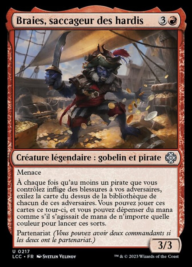| Rules | Menace Whenever one or more Pirates you control deal damage to your opponents, exile the top card of each of those opponents' libraries. You may play those cards this turn, and you may spend mana as though it were mana of any color to cast those spells. Partner (You can have two commanders if both have partner.) |