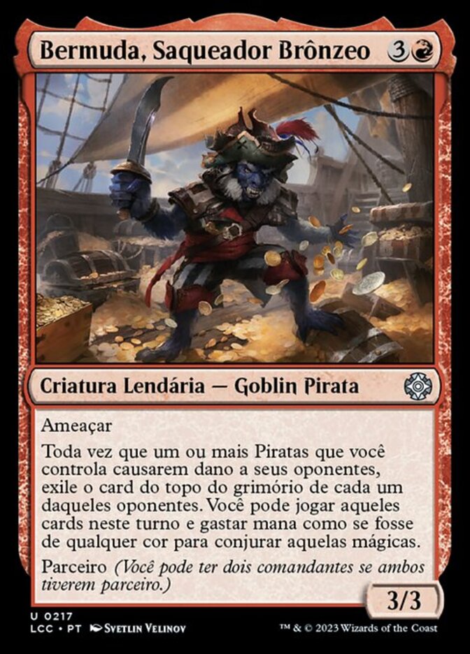 | Rules | Menace Whenever one or more Pirates you control deal damage to your opponents, exile the top card of each of those opponents' libraries. You may play those cards this turn, and you may spend mana as though it were mana of any color to cast those spells. Partner (You can have two commanders if both have partner.) |