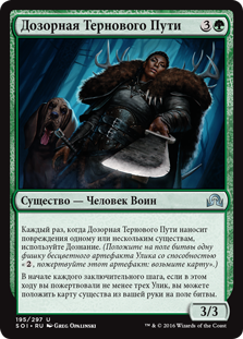 | Rules | Whenever Briarbridge Patrol deals damage to one or more creatures, investigate. (Create a colorless Clue artifact token with ", Sacrifice this artifact: Draw a card.") At the beginning of each end step, if you sacrificed three or more Clues this turn, you may put a creature card from your hand onto the battlefield. |