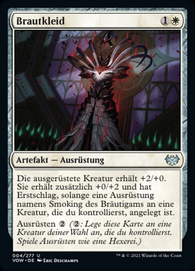 | Rules | Equipped creature gets +2/+0. It gets an additional +0/+2 and has first strike as long as an Equipment named Groom's Finery is attached to a creature you control. Equip (: Attach to target creature you control. Equip only as a sorcery.) |