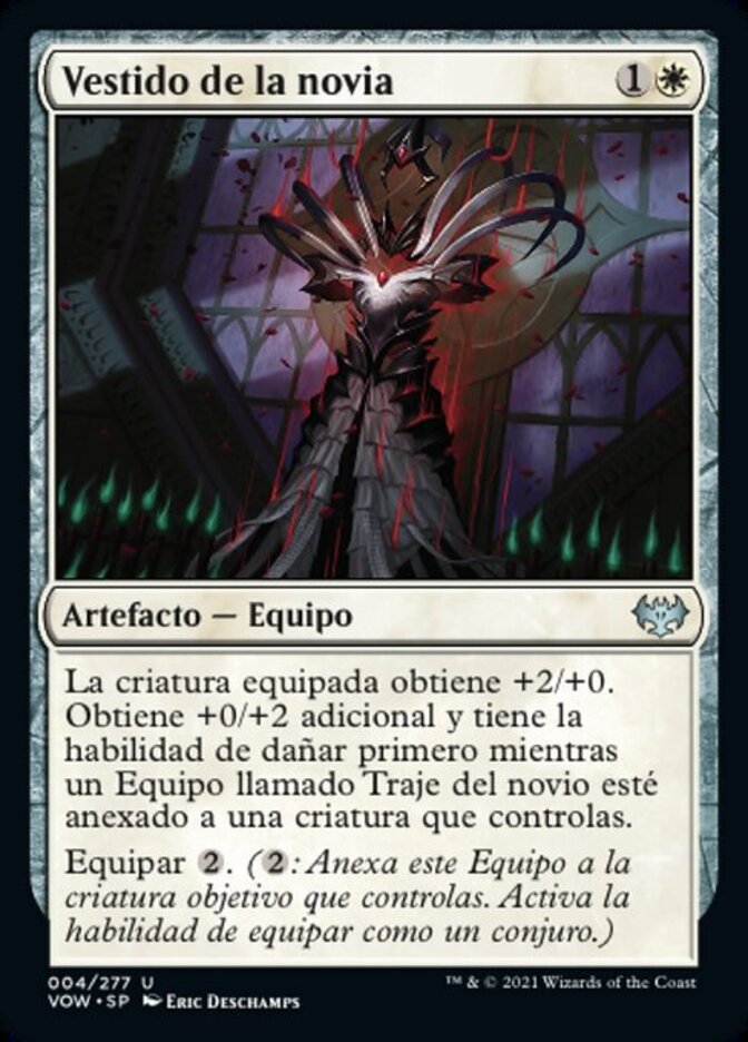 | Rules | Equipped creature gets +2/+0. It gets an additional +0/+2 and has first strike as long as an Equipment named Groom's Finery is attached to a creature you control. Equip (: Attach to target creature you control. Equip only as a sorcery.) |
