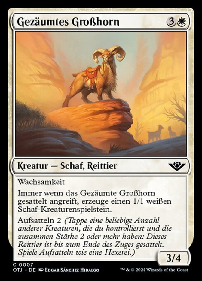 Whenever Bridled Bighorn attacks while saddled, create a 1/1 white Sheep creature token.