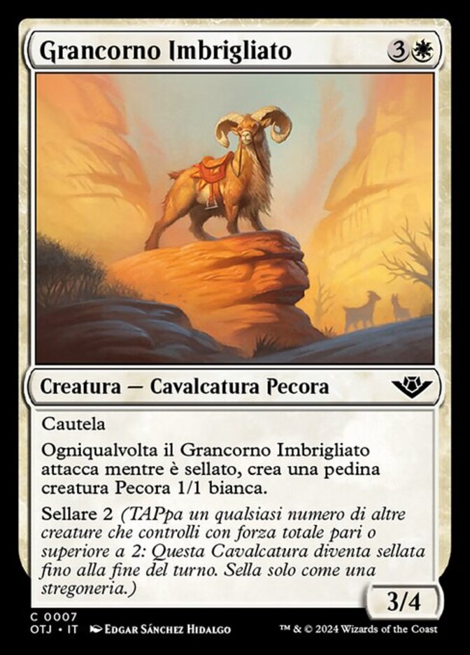 | Rules | Vigilance Whenever Bridled Bighorn attacks while saddled, create a 1/1 white Sheep creature token. Saddle 2 (Tap any number of other creatures you control with total power 2 or more: This Mount becomes saddled until end of turn. Saddle only as a sorcery.) |