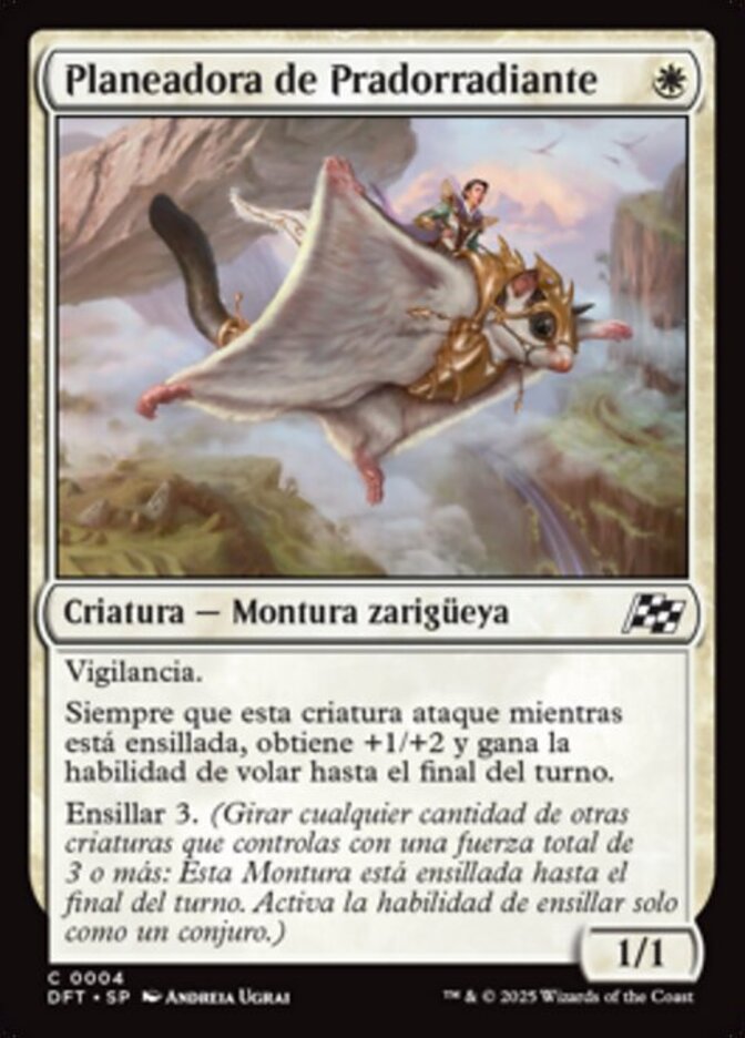 | Rules | Vigilance Whenever this creature attacks while saddled, it gets +1/+2 and gains flying until end of turn. Saddle 3 (Tap any number of other creatures you control with total power 3 or more: This Mount becomes saddled until end of turn. Saddle only as a sorcery.) |