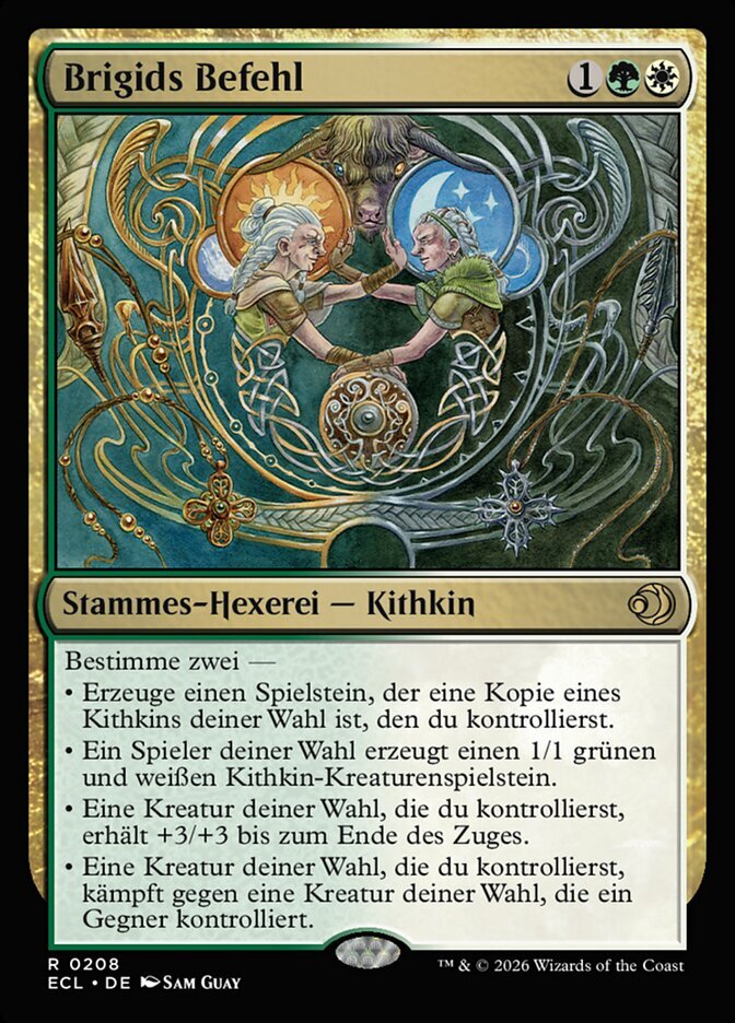 | Rules | Choose two — • Create a token that's a copy of target Kithkin you control. • Target player creates a 1/1 green and white Kithkin creature token. • Target creature you control gets +3/+3 until end of turn. • Target creature you control fights target creature an opponent controls. |