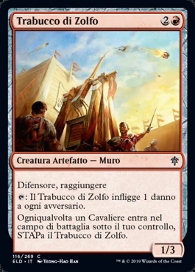 | Rules | Defender, reach : Brimstone Trebuchet deals 1 damage to each opponent. Whenever a Knight enters the battlefield under your control, untap Brimstone Trebuchet. |
