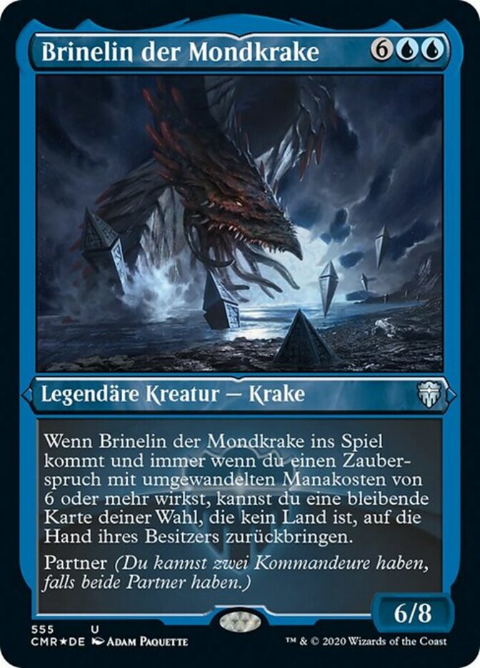 | Rules | When Brinelin, the Moon Kraken enters the battlefield or whenever you cast a spell with mana value 6 or greater, you may return target nonland permanent to its owner's hand. Partner (You can have two commanders if both have partner.) |