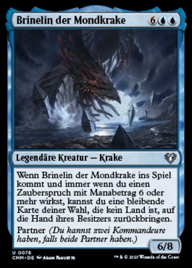 | Rules | When Brinelin, the Moon Kraken enters the battlefield or whenever you cast a spell with mana value 6 or greater, you may return target nonland permanent to its owner's hand. Partner (You can have two commanders if both have partner.) |