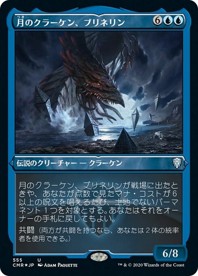 | Rules | When Brinelin, the Moon Kraken enters the battlefield or whenever you cast a spell with mana value 6 or greater, you may return target nonland permanent to its owner's hand. Partner (You can have two commanders if both have partner.) |