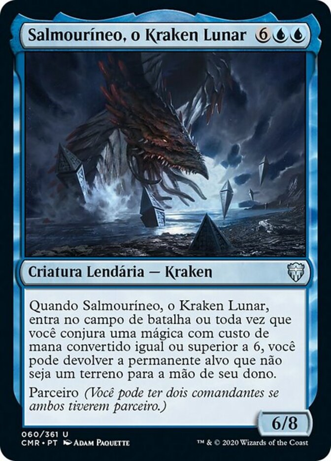 | Rules | When Brinelin, the Moon Kraken enters the battlefield or whenever you cast a spell with mana value 6 or greater, you may return target nonland permanent to its owner's hand. Partner (You can have two commanders if both have partner.) |