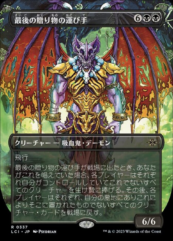 | Rules | Flying When Bringer of the Last Gift enters the battlefield, if you cast it, each player sacrifices all other creatures they control. Then each player returns all creature cards from their graveyard that weren't put there this way to the battlefield. |