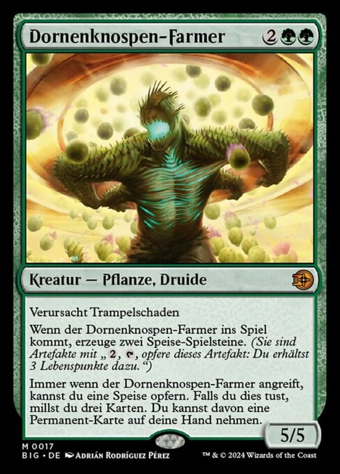 | Rules | Trample When Bristlebud Farmer enters the battlefield, create two Food tokens. (They're artifacts with ", , Sacrifice this artifact: You gain 3 life.") Whenever Bristlebud Farmer attacks, you may sacrifice a Food. If you do, mill three cards. You may put a permanent card from among them into your hand. |