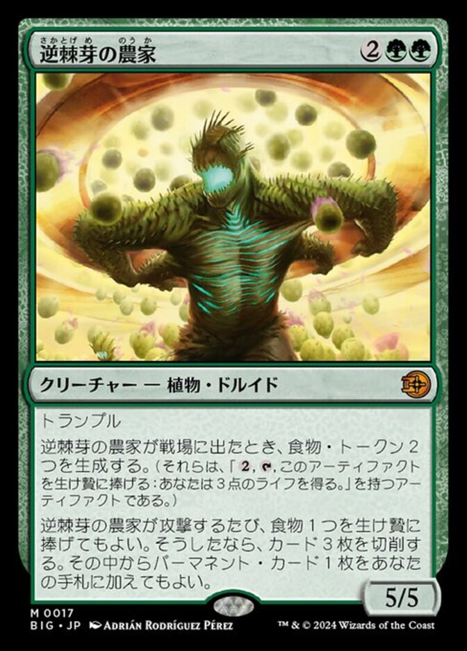| Rules | Trample When Bristlebud Farmer enters the battlefield, create two Food tokens. (They're artifacts with ", , Sacrifice this artifact: You gain 3 life.") Whenever Bristlebud Farmer attacks, you may sacrifice a Food. If you do, mill three cards. You may put a permanent card from among them into your hand. |
