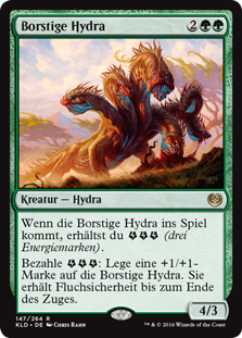 | Rules | When Bristling Hydra enters the battlefield, you get (three energy counters). Pay : Put a +1/+1 counter on Bristling Hydra. It gains hexproof until end of turn. |
