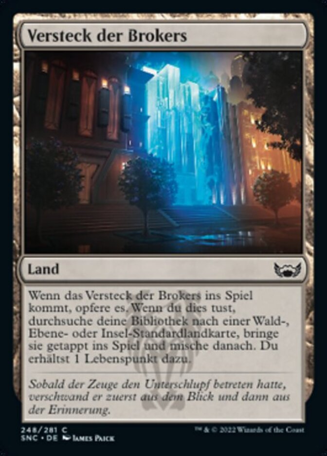 | Rules | When Brokers Hideout enters the battlefield, sacrifice it. When you do, search your library for a basic Forest, Plains, or Island card, put it onto the battlefield tapped, then shuffle and you gain 1 life. |