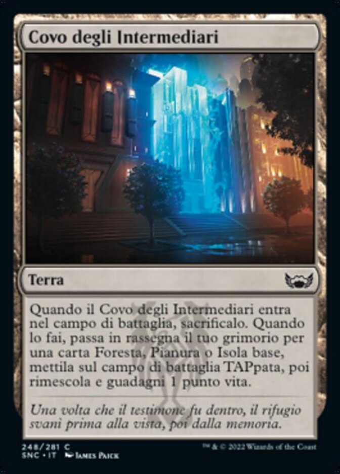| Rules | When Brokers Hideout enters the battlefield, sacrifice it. When you do, search your library for a basic Forest, Plains, or Island card, put it onto the battlefield tapped, then shuffle and you gain 1 life. |