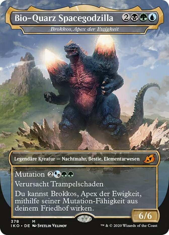 | Rules | Mutate (If you cast this spell for its mutate cost, put it over or under target non-Human creature you own. They mutate into the creature on top plus all abilities from under it.) Trample You may cast Brokkos, Apex of Forever from your graveyard using its mutate ability. |