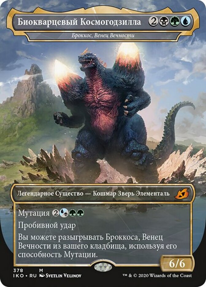 | Rules | Mutate (If you cast this spell for its mutate cost, put it over or under target non-Human creature you own. They mutate into the creature on top plus all abilities from under it.) Trample You may cast Brokkos, Apex of Forever from your graveyard using its mutate ability. |
