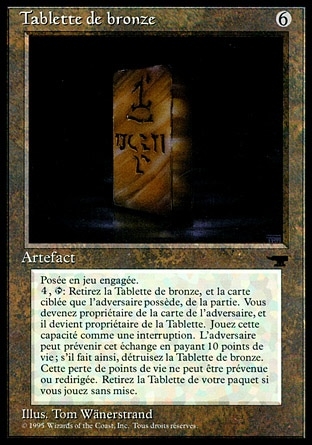 | Rules | Remove Bronze Tablet from your deck before playing if you're not playing for ante. Bronze Tablet enters the battlefield tapped. , : Exile Bronze Tablet and target nontoken permanent an opponent owns. That player may pay 10 life. If they do, put Bronze Tablet into its owner's graveyard. Otherwise, that player owns Bronze Tablet and you own the other exiled card. |