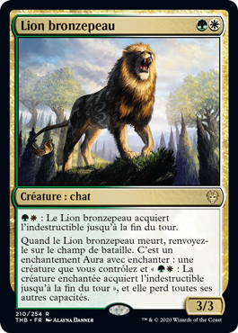 | Rules | : Bronzehide Lion gains indestructible until end of turn. When Bronzehide Lion dies, return it to the battlefield. It's an Aura enchantment with enchant creature you control and ": Enchanted creature gains indestructible until end of turn," and it loses all other abilities. |
