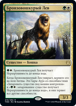 | Rules | : Bronzehide Lion gains indestructible until end of turn. When Bronzehide Lion dies, return it to the battlefield. It's an Aura enchantment with enchant creature you control and ": Enchanted creature gains indestructible until end of turn," and it loses all other abilities. |