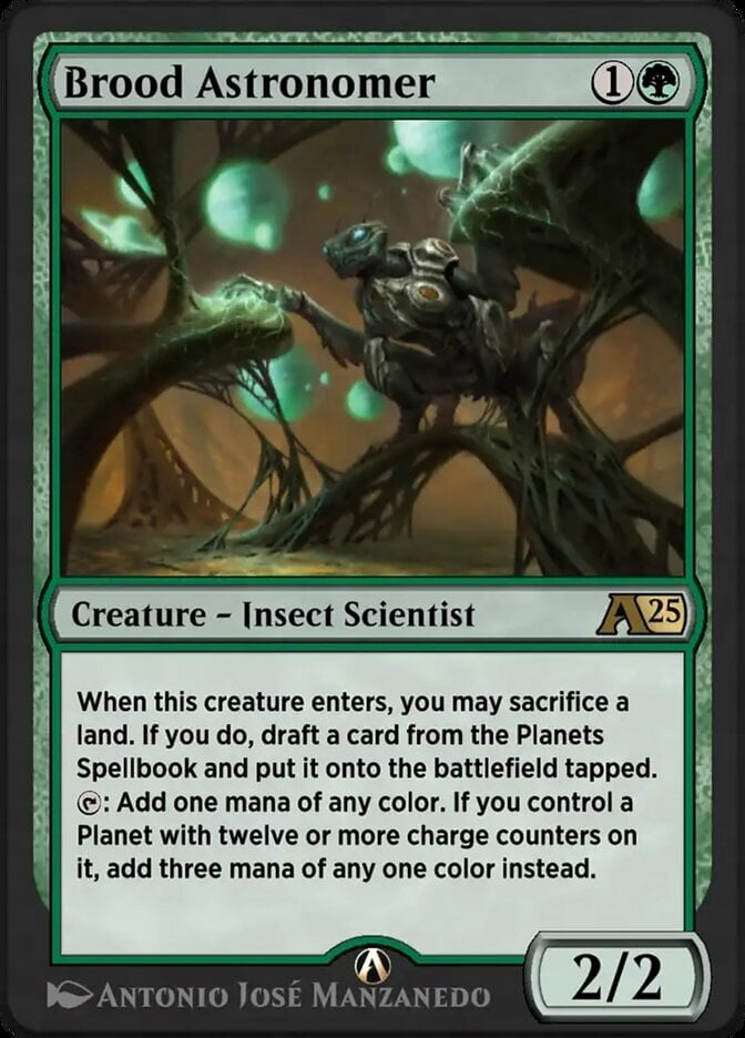 | Rules | When this creature enters, you may sacrifice a land. If you do, draft a card from the Planets Spellbook and put it onto the battlefield tapped. : Add one mana of any color. If you control a Planet with twelve or more charge counters on it, add three mana of any one color instead. |