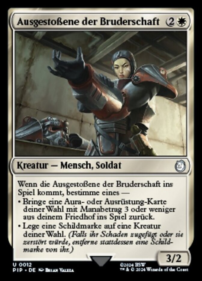 | Rules | When Brotherhood Outcast enters the battlefield, choose one — • Return target Aura or Equipment card with mana value 3 or less from your graveyard to the battlefield. • Put a shield counter on target creature. (If it would be dealt damage or destroyed, remove a shield counter from it instead.) |