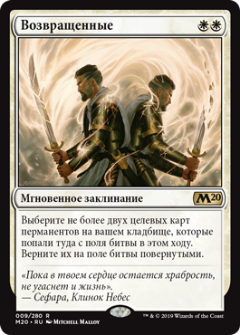 | Rules | Choose up to two target permanent cards in your graveyard that were put there from the battlefield this turn. Return them to the battlefield tapped. |