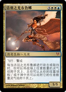 | Rules | Flying, vigilance Whenever Bruna, Light of Alabaster attacks or blocks, you may attach to it any number of Auras on the battlefield and you may put onto the battlefield attached to it any number of Aura cards that could enchant it from your graveyard and/or hand. |