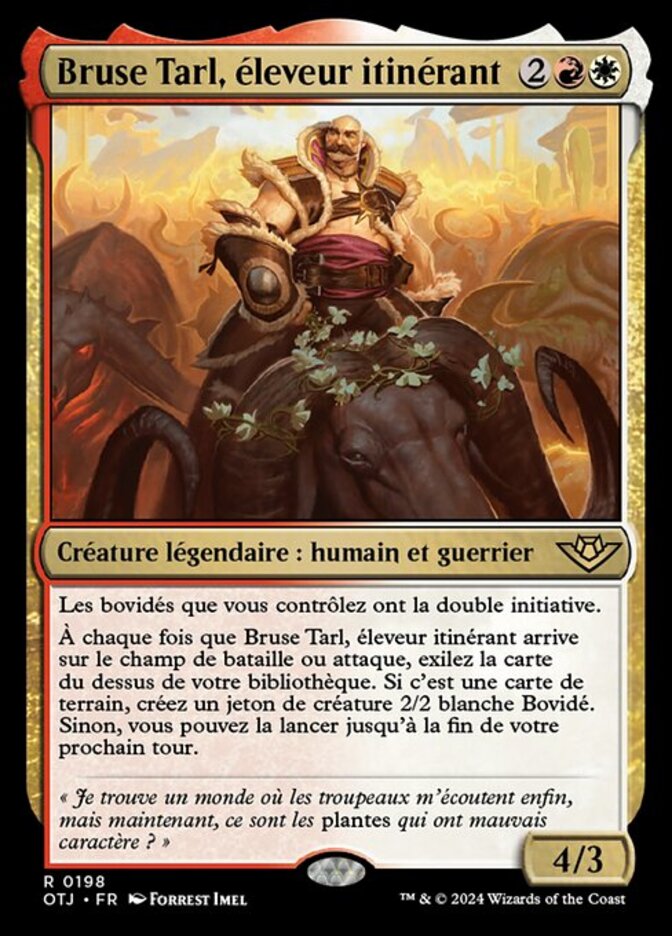 | Rules | Oxen you control have double strike. Whenever Bruse Tarl, Roving Rancher enters the battlefield or attacks, exile the top card of your library. If it's a land card, create a 2/2 white Ox creature token. Otherwise, you may cast it until the end of your next turn. |