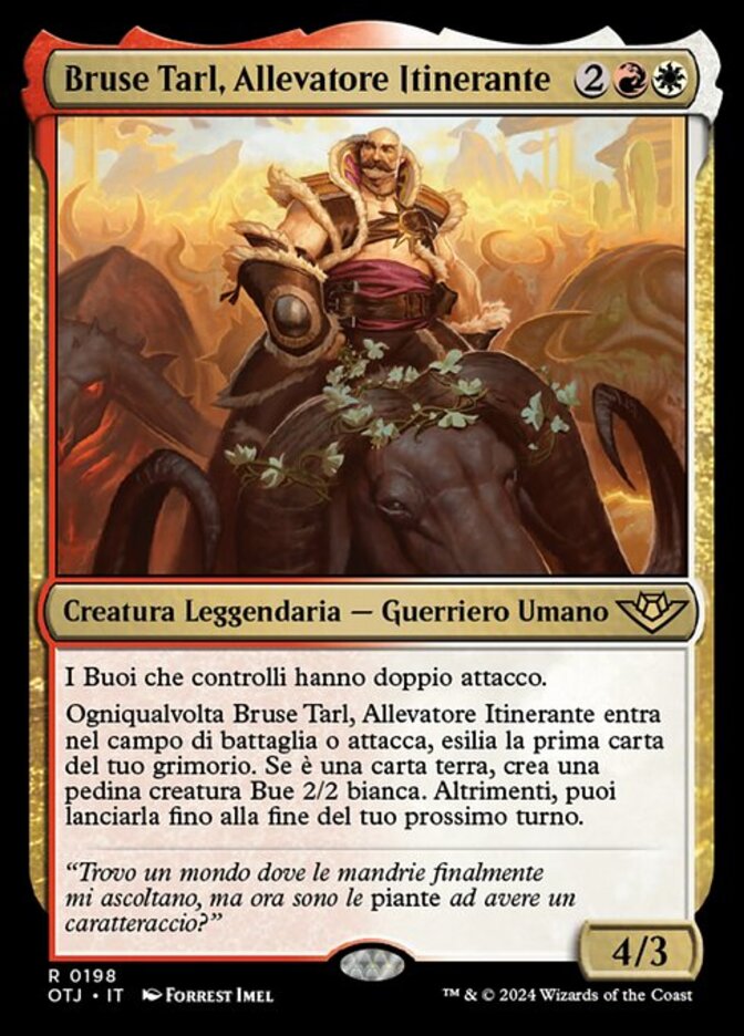 | Rules | Oxen you control have double strike. Whenever Bruse Tarl, Roving Rancher enters the battlefield or attacks, exile the top card of your library. If it's a land card, create a 2/2 white Ox creature token. Otherwise, you may cast it until the end of your next turn. |
