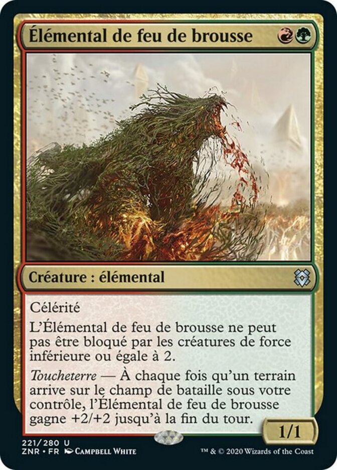 | Rules | Haste Brushfire Elemental can't be blocked by creatures with power 2 or less. Landfall — Whenever a land enters the battlefield under your control, Brushfire Elemental gets +2/+2 until end of turn. |