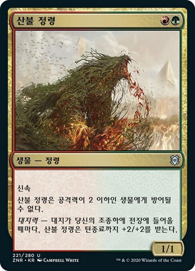 | Rules | Haste Brushfire Elemental can't be blocked by creatures with power 2 or less. Landfall — Whenever a land enters the battlefield under your control, Brushfire Elemental gets +2/+2 until end of turn. |