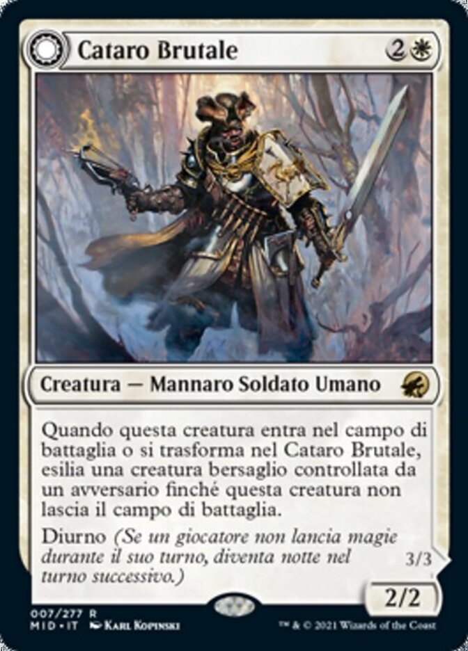 | Rules | When this creature enters the battlefield or transforms into Brutal Cathar, exile target creature an opponent controls until this creature leaves the battlefield. Daybound (If a player casts no spells during their own turn, it becomes night next turn.) // First strike Ward—Pay 3 life. Nightbound (If a player casts at least two spells during their own turn, it becomes day next turn.) |