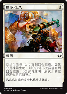 | Rules | Target creature gets +2/+2 until end of turn. If it's an artifact creature, it gains indestructible until end of turn. (Damage and effects that say "destroy" don't destroy it.) |