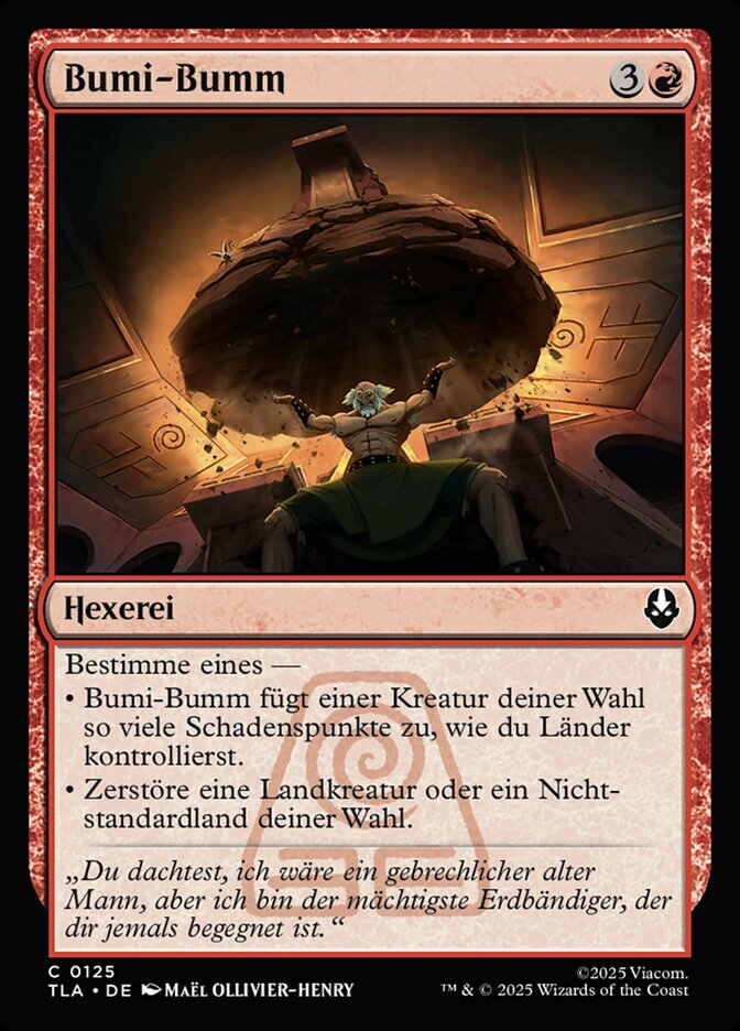 | Rules | Choose one — • Bumi Bash deals damage equal to the number of lands you control to target creature. • Destroy target land creature or nonbasic land. |