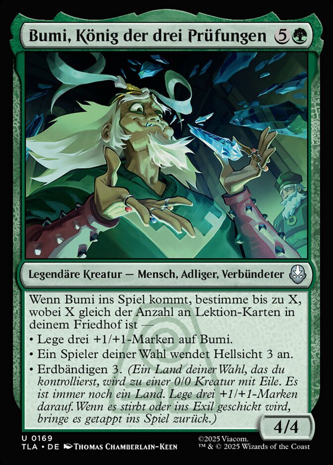 | Rules | When Bumi enters, choose up to X, where X is the number of Lesson cards in your graveyard — • Put three +1/+1 counters on Bumi. • Target player scries 3. • Earthbend 3. (Target land you control becomes a 0/0 creature with haste that's still a land. Put three +1/+1 counters on it. When it dies or is exiled, return it to the battlefield tapped.) |