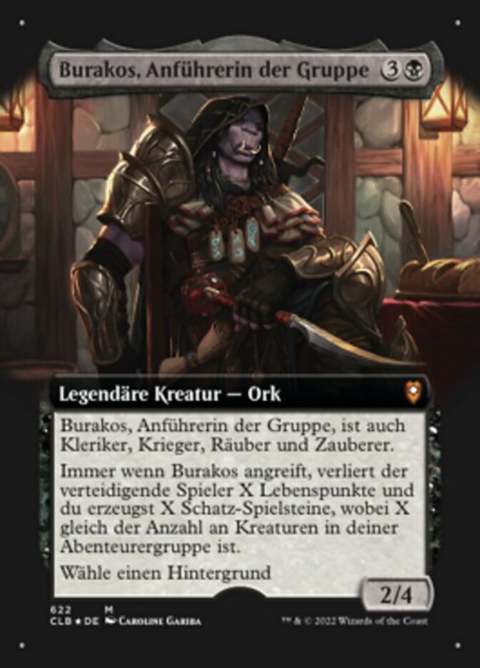 | Rules | Burakos, Party Leader is also a Cleric, Rogue, Warrior, and Wizard. Whenever Burakos, Party Leader attacks, defending player loses X life and you create X Treasure tokens, where X is the number of creatures in your party. Choose a Background (You can have a Background as a second commander.) |