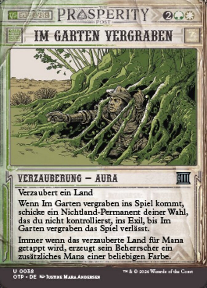 | Rules | Enchant land When Buried in the Garden enters the battlefield, exile target nonland permanent you don't control until Buried in the Garden leaves the battlefield. Whenever enchanted land is tapped for mana, its controller adds an additional one mana of any color. |
