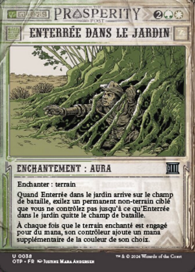 | Rules | Enchant land When Buried in the Garden enters the battlefield, exile target nonland permanent you don't control until Buried in the Garden leaves the battlefield. Whenever enchanted land is tapped for mana, its controller adds an additional one mana of any color. |