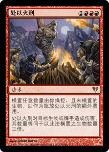 | Rules | As an additional cost to cast this spell, tap any number of untapped creatures you control. Burn at the Stake deals damage to any target equal to three times the number of creatures tapped this way. |