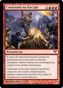 | Rules | As an additional cost to cast this spell, tap any number of untapped creatures you control. Burn at the Stake deals damage to any target equal to three times the number of creatures tapped this way. |