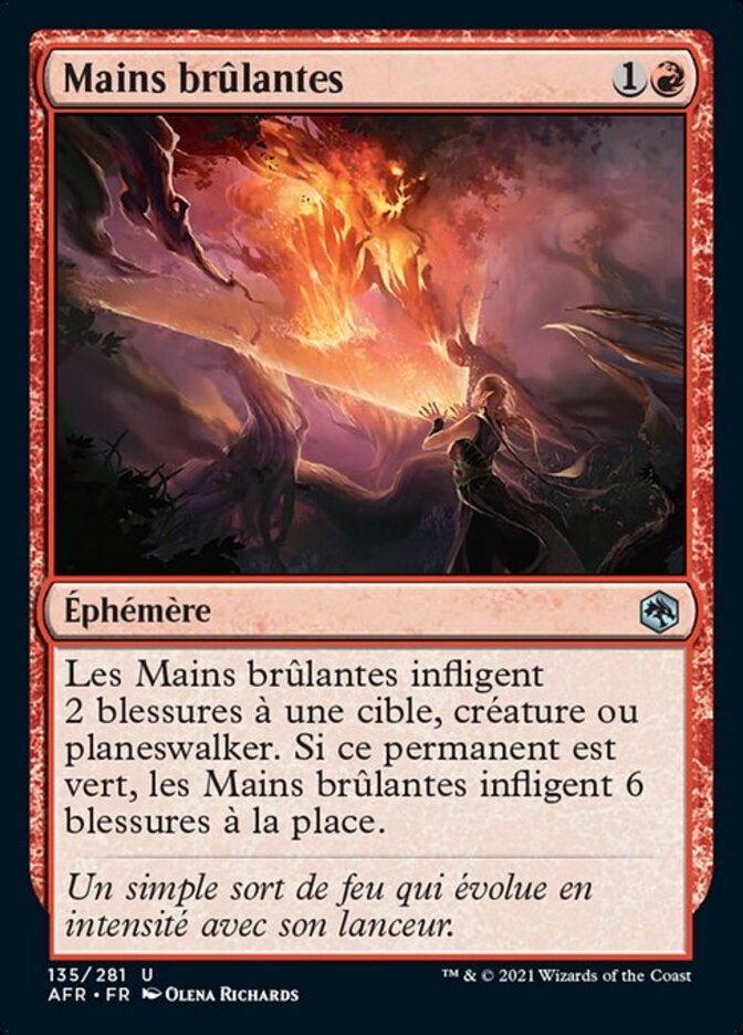| Rules | Burning Hands deals 2 damage to target creature or planeswalker. If that permanent is green, Burning Hands deals 6 damage instead. |