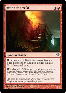 Rules Burning Oil deals 3 damage to target attacking or blocking creature.