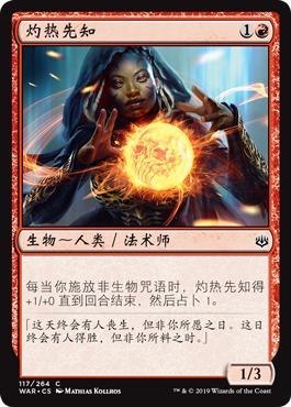 | Rules | Whenever you cast a noncreature spell, Burning Prophet gets +1/+0 until end of turn, then scry 1. |