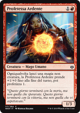 | Rules | Whenever you cast a noncreature spell, Burning Prophet gets +1/+0 until end of turn, then scry 1. |