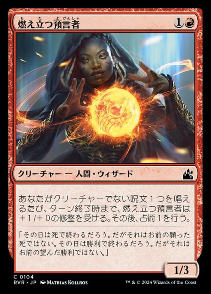 | Rules | Whenever you cast a noncreature spell, Burning Prophet gets +1/+0 until end of turn, then scry 1. |