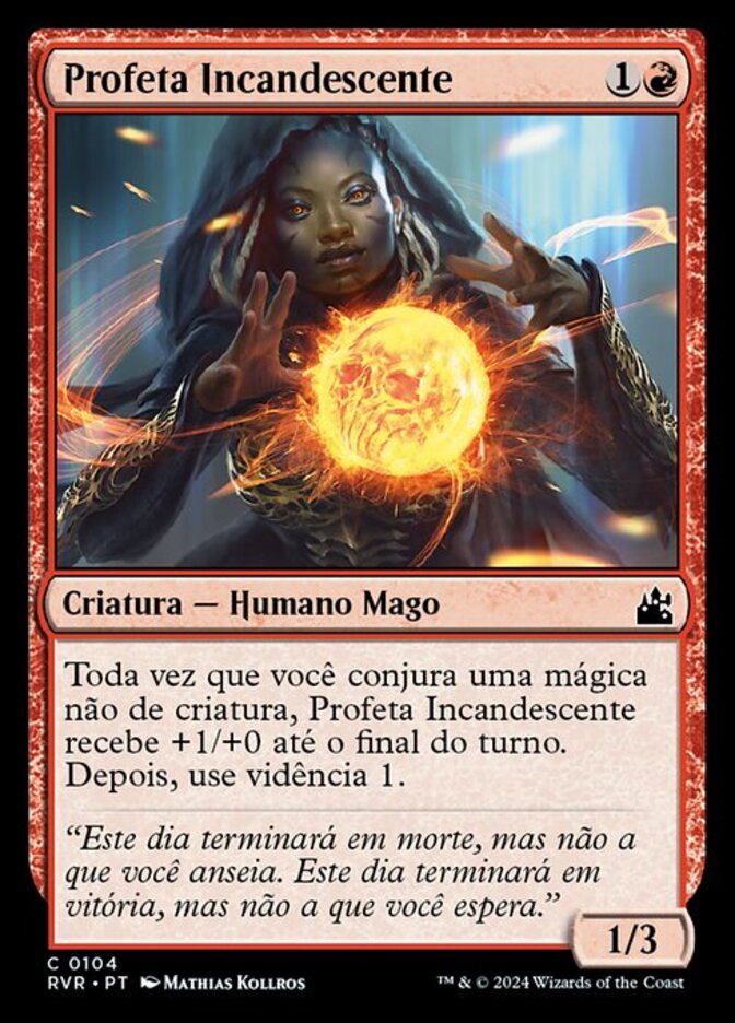 | Rules | Whenever you cast a noncreature spell, Burning Prophet gets +1/+0 until end of turn, then scry 1. |