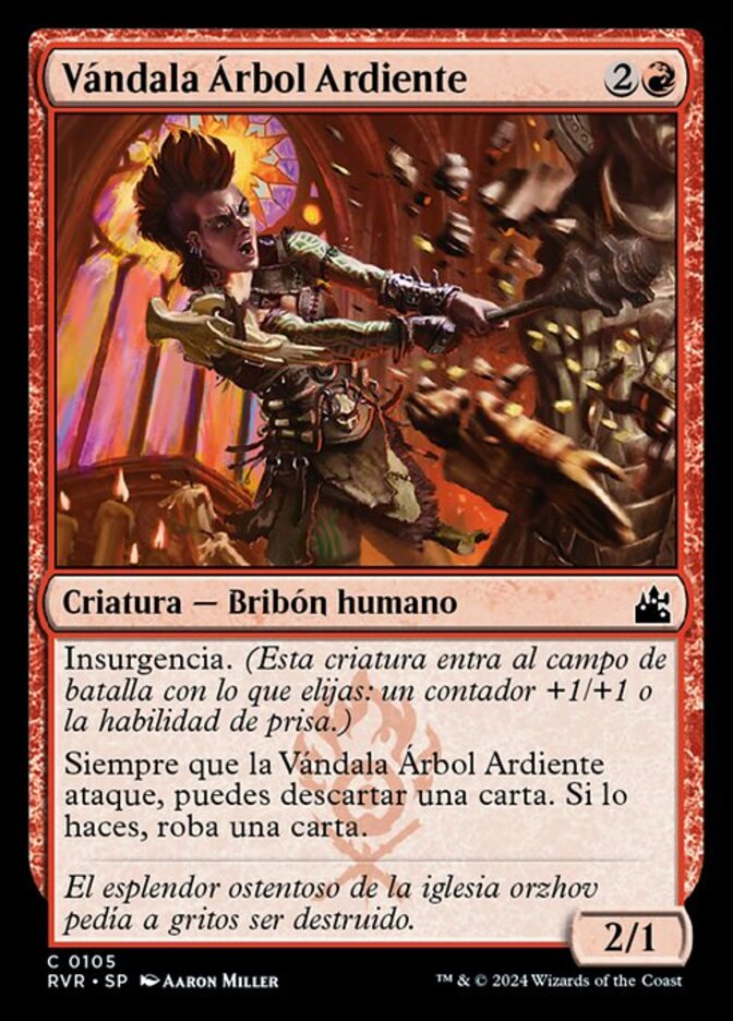 | Rules | Riot (This creature enters the battlefield with your choice of a +1/+1 counter or haste.) Whenever Burning-Tree Vandal attacks, you may discard a card. If you do, draw a card. |