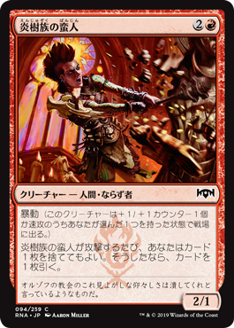 | Rules | Riot (This creature enters the battlefield with your choice of a +1/+1 counter or haste.) Whenever Burning-Tree Vandal attacks, you may discard a card. If you do, draw a card. |